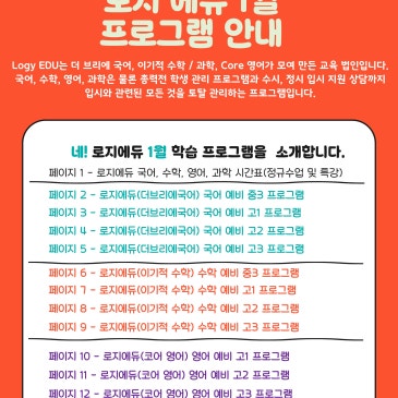 안녕하세요. 로지에듀입니다. 오늘은 우리 학원 1월 국어, 수학, 영어, 과학, 총력전 프로그램에 대한 소개를 하려 합니다. 먼저 우리 학원 전체 시간표에 대한 안내를 드리겠습니다. 조금 복잡하게 느껴지실 수도 있겠는데요. 국어, 수학, 영어 등 모든 선생님들이 이번 방학기간에 아이들을 위해 많은 것들을 가르쳐 주고 싶은 마음이라고 생각해 주시기 바랍니다. 다음은 국어 과목에 대한 안내입니다. 국어는 예비 중3부터 예비 고3까지 다양한 수업이 개설되어 있습니다. 또한 학생들에게 꼭 필요한 다양한 특강 프로그램 역시 개설되어 있으니 많은 관심 부탁드립니다. 수학 역시 다음 학기 내신을 대비하기 위한 다양한 정규 수업과 특강…….