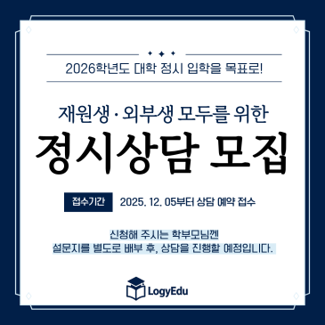 안녕하세요, 더 브리에 국어, 이기적 수학, 과학, 코어 잉글리시가 함께 모여 만든 교육법인 로지 에듀입니다. 수능 성적표가 나오는 12월 5일부터 본격적으로 정시상담 예약 접수를 시작합니다. *신청해 주시는 학부모님껜 설문지를 별도로 배부 후, 설문지 토대로 상담을 진행할 예정입니다.* 정시상담은 일반상담과 심층상담 두 가지로 나뉘어집니다. 1. 일반 상담 : 재원생,재원생형제 5만원 / 외부생 15만원 – 가군, 나군, 다군 군별 학교 선택 – 상향, 안정, 하향 전략별 학교 선택 2. 심층 상담 : 재원생,재원생형제 10만원 / 외부생 30만원 – 가군, 나군, 다군 군별 학교 선택 – 상향, 안정, 하향 전략별 학교 선택 – 국공립대 및 특수 대……. ![]()